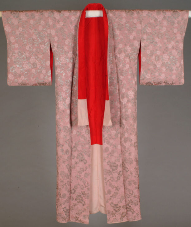 Woven kimono, such as the pink one displayed here, are worn with a Nagoya obi, a modified version of the heavy and long traditional obi. In Nagoya obi, the fabric that wraps around the body is sewn into a narrower strip and about a third of the fabric is left unsewn for tying. Thus, while the Nagoya obi’s dimensions and appearance when worn are quite similar to those of formal fukuro obi, which must be folded multiple times before being tied, they are lighter and easier to handle. The Nagoya obi is a relatively modern invention, created by a seamstress in the city of Nagoya in the late 1920s for use as casual wear. It originally became popular in the geisha quarters of Tokyo for use with informal kimono. From there it was adopted as casual wear for style-conscious urbanites. For modern women, the more comfortable Nagoya obi has become the preferred type because of its ease of use. Mother and business woman Iwata Shizuka owned many Nagoya obi, which, with woven kimono and haori, were essential parts of her office attire.