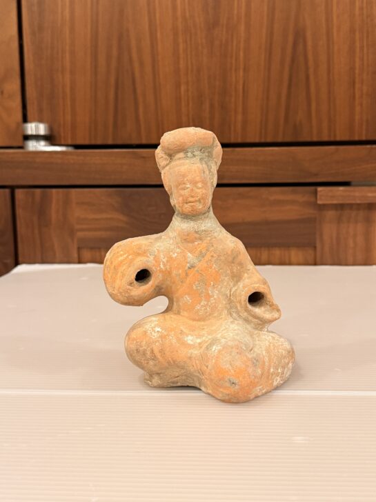 A red earthenware figure of a kneeling woman wearing a long robe, and elaborately dressed hair. Both her arms are slightly raised, with pierced holes in the sleeves where hands should be. It is covered in traces of slip and polychrome pigment, and there is loss to hands.