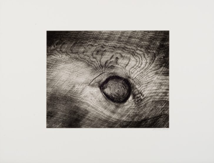 A very close shot of a dark, oblong knot in a wood plank. Ripples of the woodgrain radiate upward from the knot, crossed diagonally by straight lines made when the plank was cut.