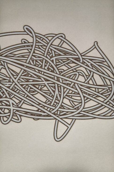 Light green threads intersecting, creating a tangled mass on a cream-colored background.