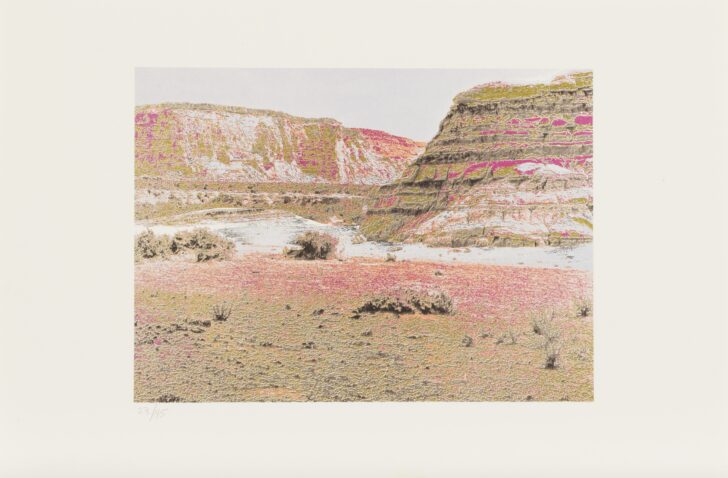 An image of a flat, rocky area speckled with shrubs and looming mesas in the background.