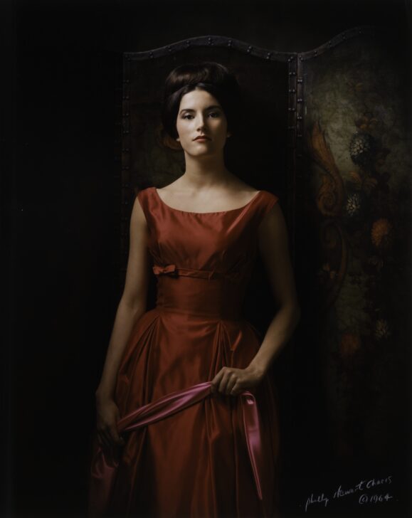 Image of a woman wearing a red dress, clutching a pink sash, leaning against a painted screen.