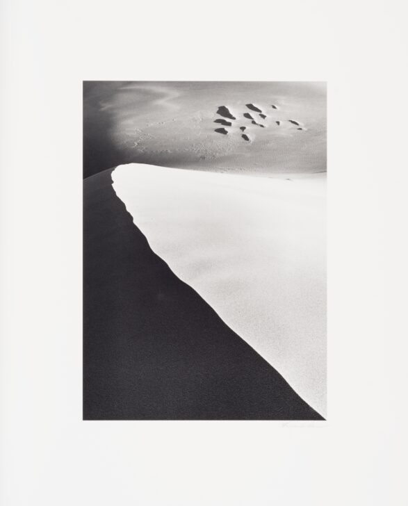 The sun hits the side of huge, featurelesss dune, plunging half of it into blackness. Several small dunes nestle together on a ridge-filled plain.