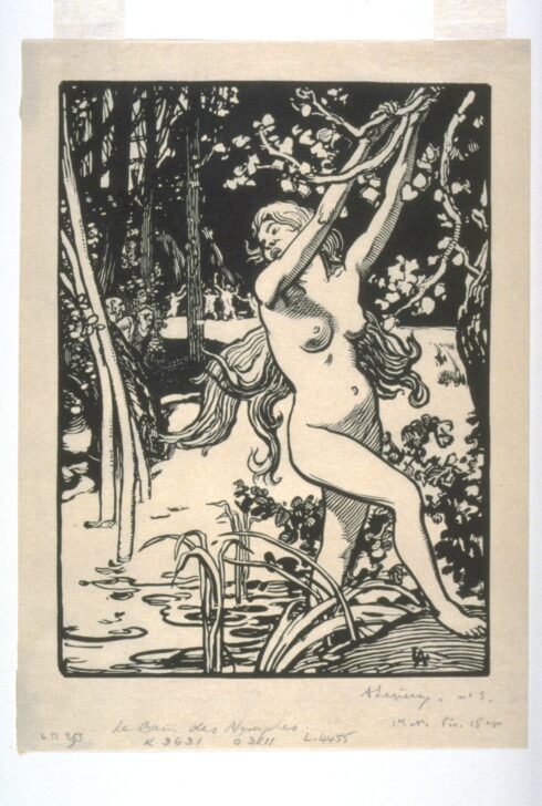 A black and white print of a nude woman with long hair, one foot in a body of water with plants growing out of it and one foot out of the water. Her arms are going upwards and she is holding onto a branch as she looks back over her shoulder.