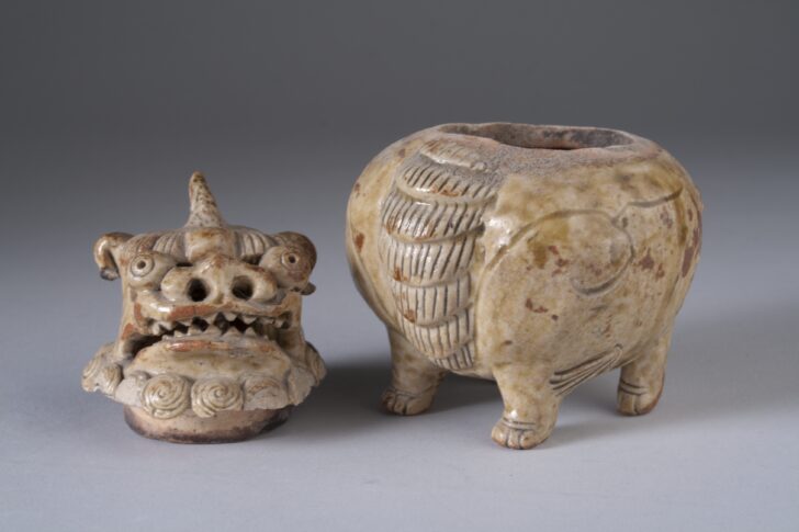 A container with an animal (dragon) shaped head as a lid; four paws at the bottom of the container. Glazed stoneware, sculpted with teeth incisions. Tan with red spots of coloring, partiallyy covered with olive colored gloss over a high-fire red clay. Small swirl design on sides and front area has carving to indicate the front/chest of the animal, sculpted with teeth and incisions.