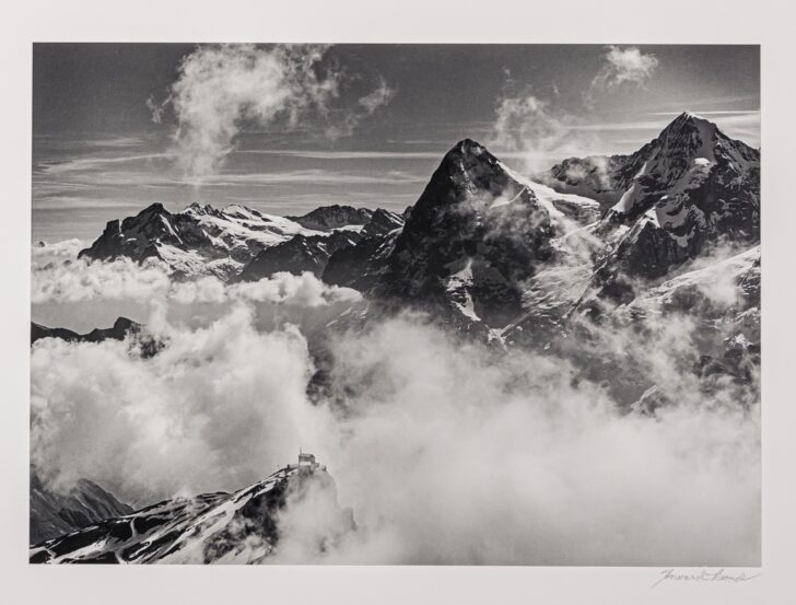 A dark mountain range with two prominent triangular peaks rises from a mist of clouds. A simple, man-made structure rests on a lower peak.