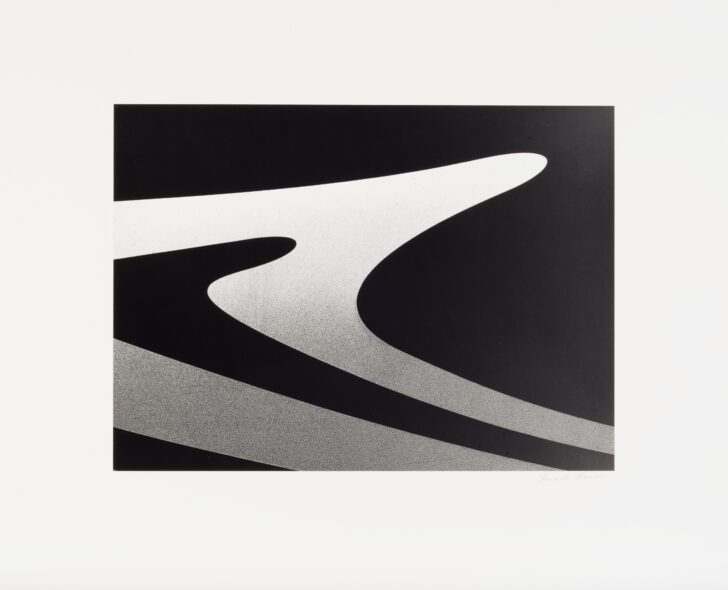 A sharply twisting curve glows brightly against a black background, fading to gray in the bottom half of the image. A thick line of the same gray crosses the bottom of the image.