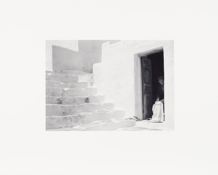 The walls and stairs of a stucco structure form right-angled lines of shadow and light across most of this image. At right, an old man in a hat and dark clothes sits in a doorway with a towel draped over his knees.
