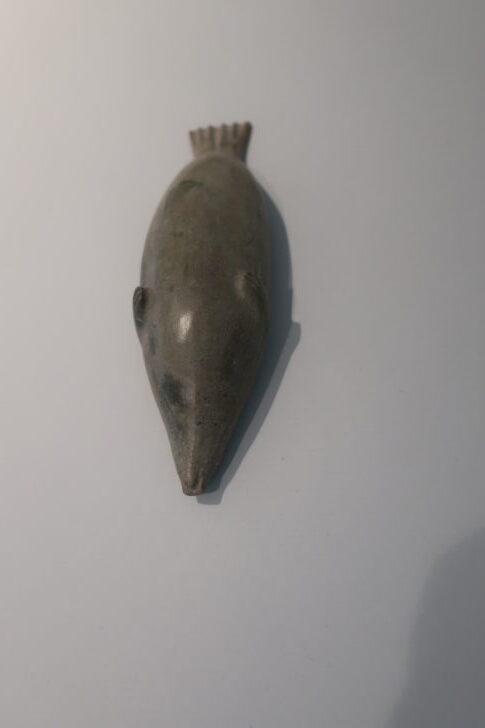 A stone carving of a kayak that serves as the base for Man with Seal in Kayak. It has two pieces of skin rope across the top, one at the center and one towards the end. There are two holes where the human figure and the seal can be attached.
