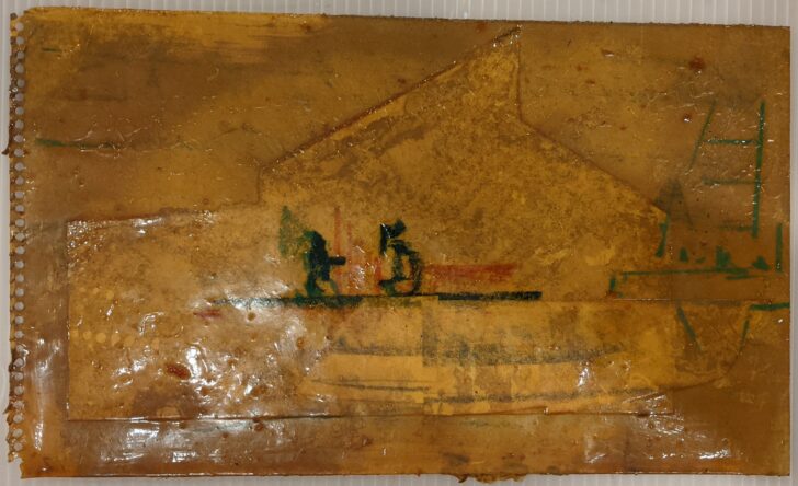 Layered yellow paper with two small line-drawn figures in the center of the paper.