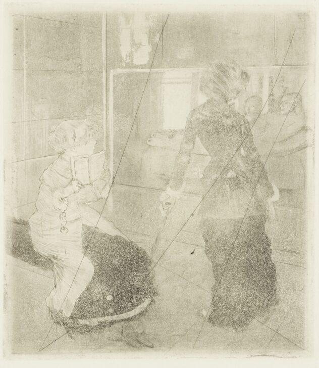 A black and white image of a young woman, seated and holding a book in both hands, while another stands with her back to her. In the background, on the wall, hangs a picture depicting two women reclining. Sharp, thin lines run across the image.