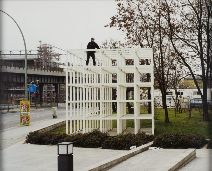 Color photograph of a man standing in a cube-shaped structure made of white slats in an urban area.