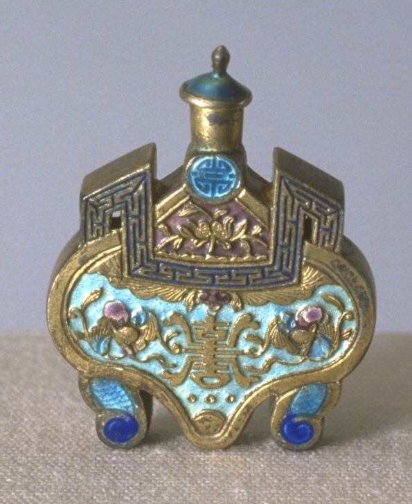 Metal enamelled snuff bottle decorated with the character “Shou” [Longevity]
