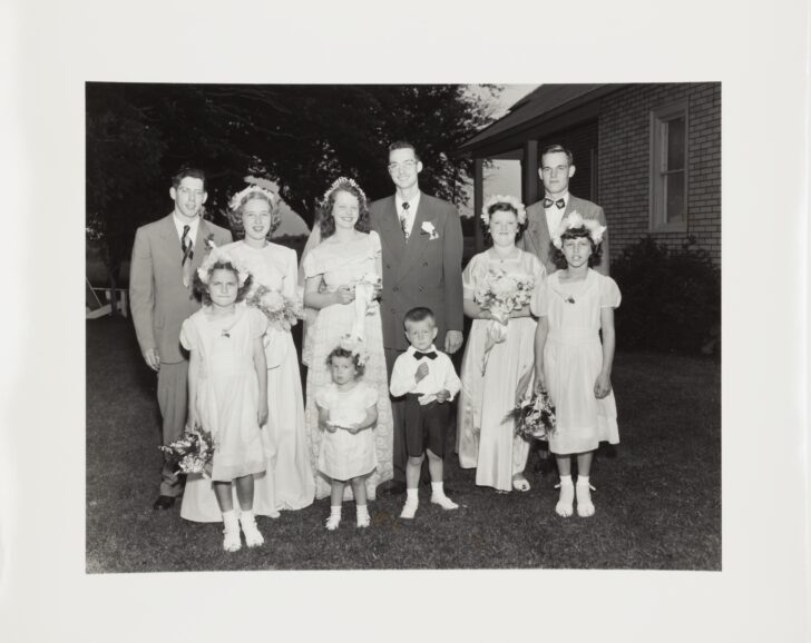 A black and white image of three men, one woman, five girls, and one boy standing in front of a house. The woman wears a veil and she and four girls hold bouquets. The men wear suits and boutonniers. The small girl and boy stand in front of the rest of the party.