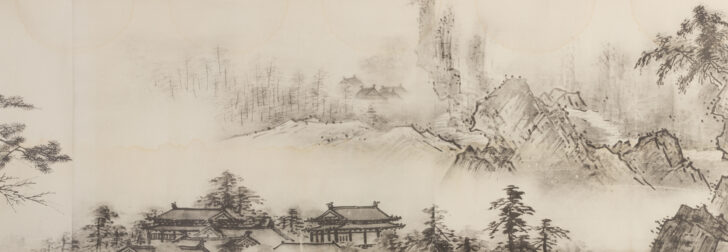 This print is meant to be an exact copy, or facsimile, of Sesshu Toyo's landscape painting. Sesshu Toyo was a prominent painter of ink and ink wash style paintings. He predominantly painted landscapes and due to the notoriety of his work, it has been replicated, as we can see here.