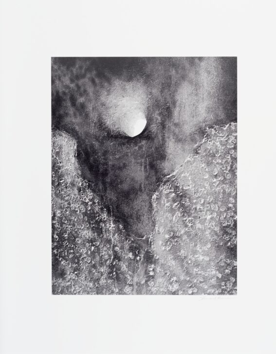 A glowing white hole at upper center rests in a dark surface that, at bottom, is covered in a pattern of uneven shapes outlined in white.