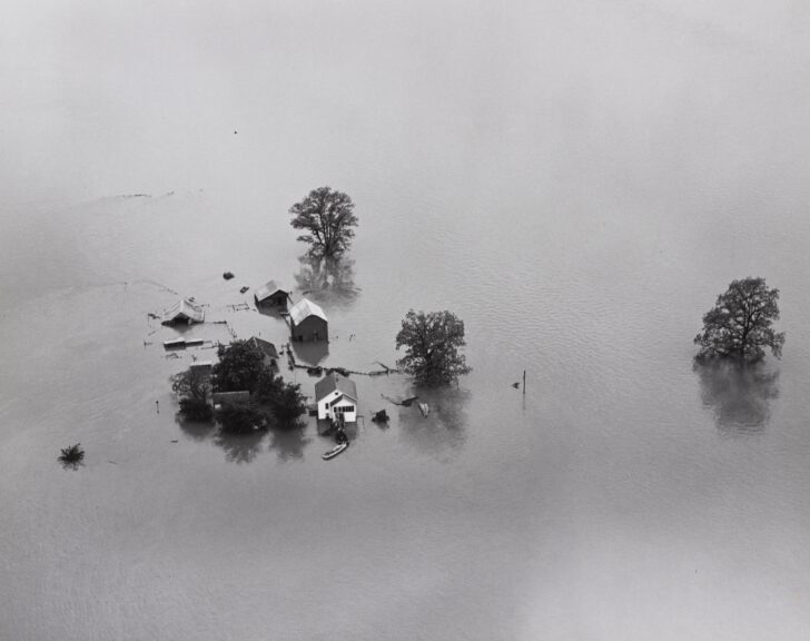 An aerial view of a flooded farmhouse, outbuildings and trees with boats at the farmhouse door.