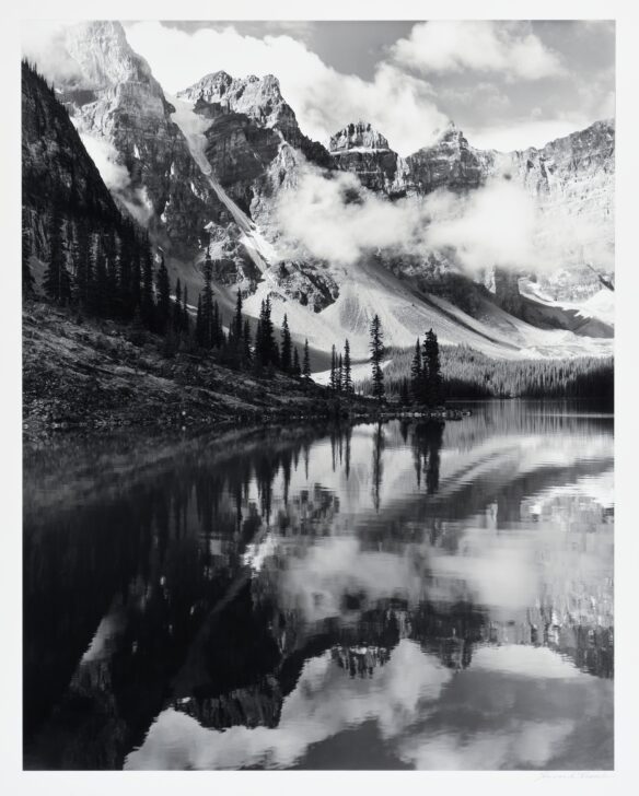 A softly rippling lake reflects the sky and surrounding landscape. Its rocky shore slopes down from the left, traced by a line of tall, spare evergreen trees. In the far distance, large mountains stand behind low clouds.