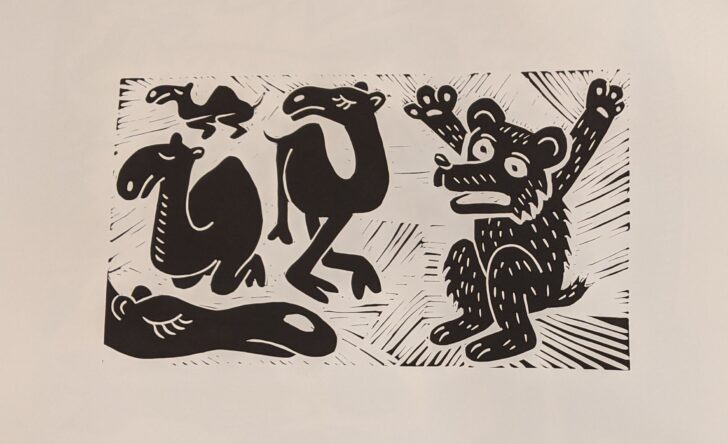 A print in black. On the viewer's left are four dromedary camels, one sticking its head into the frame in the bottom left corner, one kneeling, one standing with crossed front legs, and one standing, seemingly further away. On the viewer's right, an open-mouthed bear sits, holding its arms out above its head.