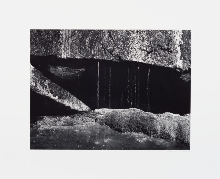 Seven or more thin streams of water fall from a glistening rock slab across the opening to an alcove hidden in shadow. Thick moss grows at the edge of the pool these streams have created.