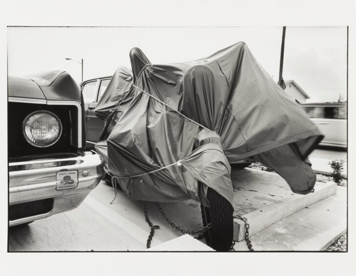 A black and white image of a motorcycle covered in a tied-down tarp.
