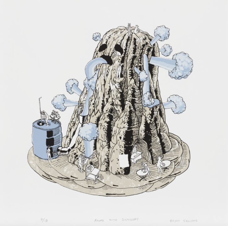 Image of a brown mound with blue plumes emerging from it. There are small white figures on and around the mound. One figure is on a blue cask connected to the mound by a white pipe.