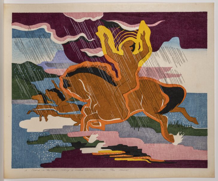 An image of a nude man riding a brown horse in the rain, with two other horses in the background.