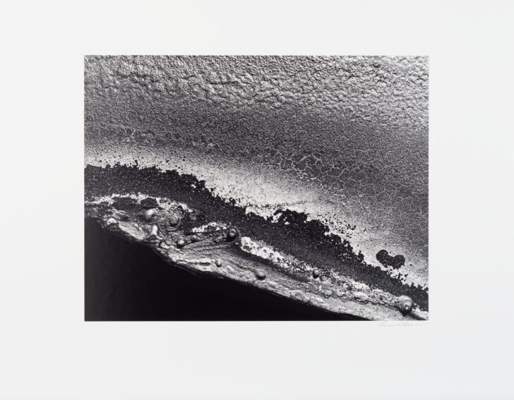 A smoothly scaled surface is cut off by a black, sandy stripe crossing from mid-left to the bottom right corner. Just below, another stripe of bubbled metal follows this same path. The left bottom corner of the image is solid black.
