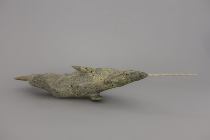 The body of a narwhal carved from shiny serpentine stone in a mottled greenish grey. The animal is positioned on its side, with one flipper underneath it and one up in the air. The tail is also lifted up in the air as though it is swimming. There is a hole on the front of its head where the ivory tusk can be attached.