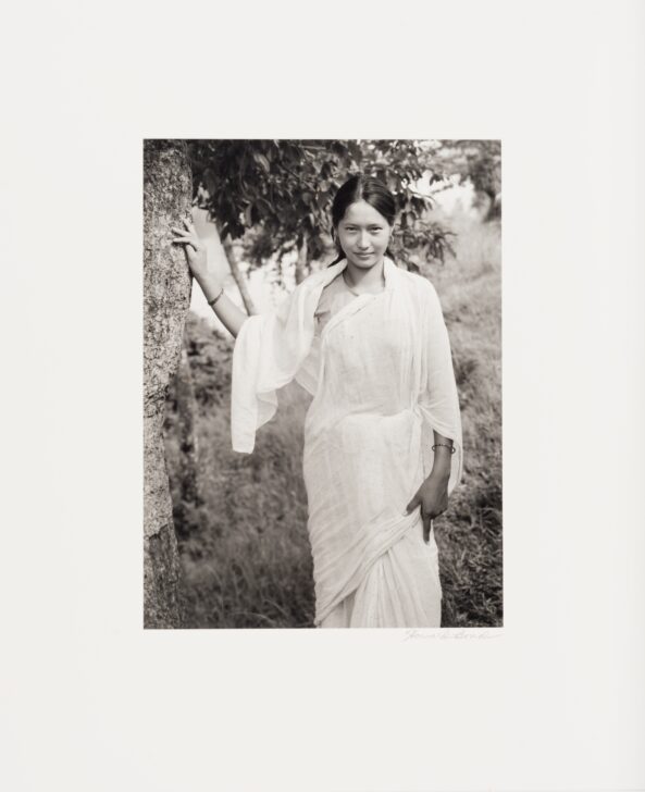 A young girl wearing a light-colored garment stands with right hand raised to rest on a tree. She smiles into the camera.