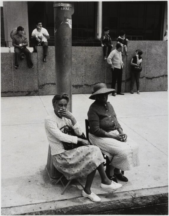 Newark Essay (woman seated at street corner on stools, others waiting at concrete wall)