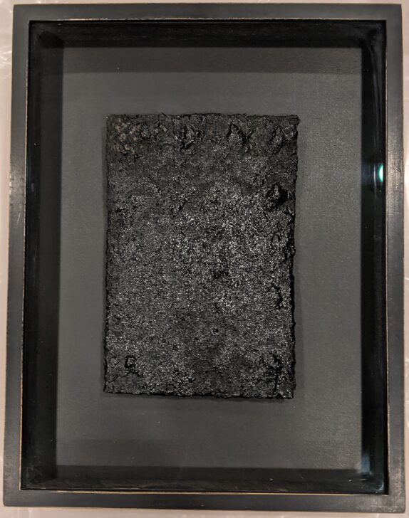 Monotoned dark gray or black surfaced rectangle with a grainy surface mounted on smoother surface with the same color.