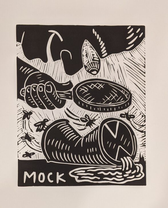 Printed in black, a smiling face in profile with a bulging eye looks down from the top edge, holding a magnifying glass over a can. The can is bent in the middle with liquid seeping out the end into a puddle and is surrounded by flies. In the bottom left corner, "MOCK" is printed in block letters.