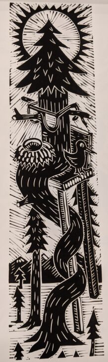 Printed in black, a tree trunk wearing glasses with branches for ears and a nose and evergreen foliage on top sits on a tall chair, its trunk spiraling around one of the chair legs before being rooted in the ground. The tree holds an object in its lap and a bird on the edge of the chair. Beneath the chair are other trees, and there are mountains and a sun in the background.