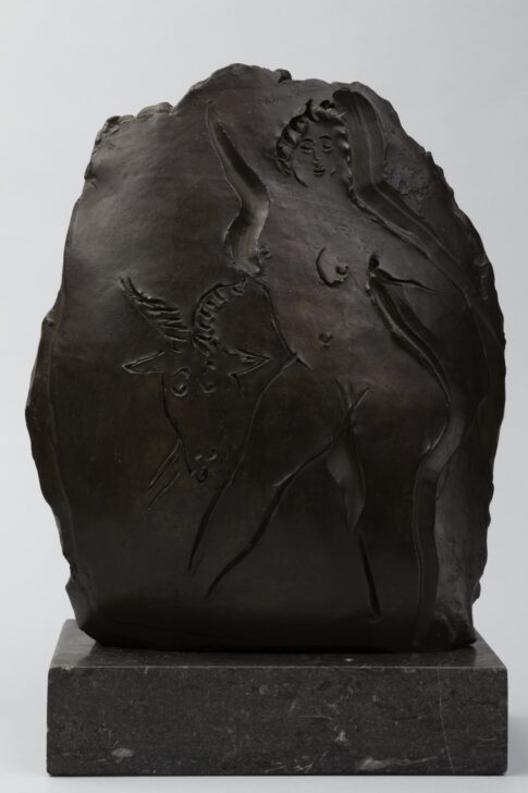 A hollow, convex sculpture with an incized image of a woman and a goat. The bronze element rests on a marble base.