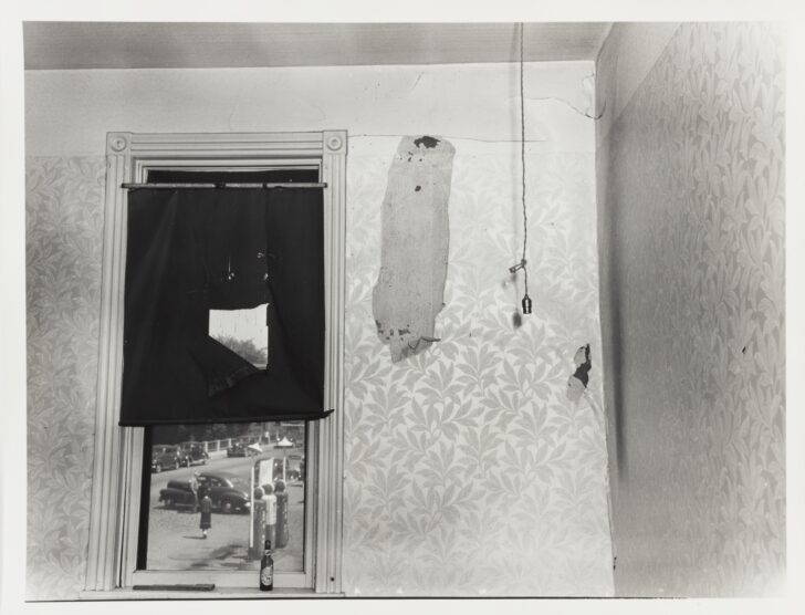 A black and white image of the interior of a room with a window facing a street or parking lot. The wallpaper is peeling and stained and the windowshade is torn.