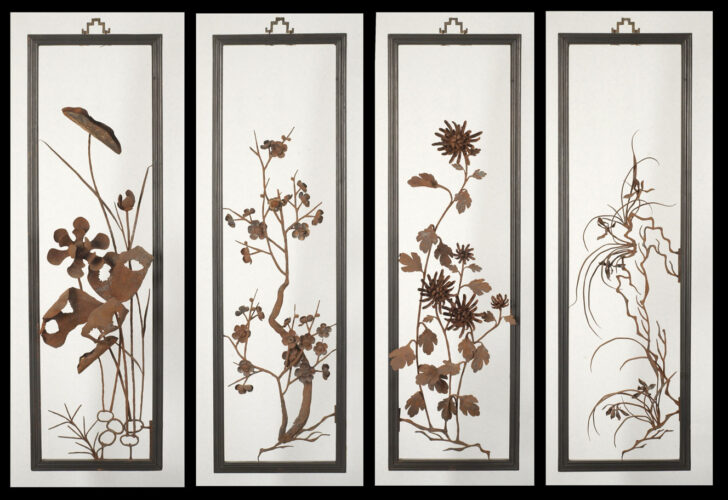 Decorative ironwork was popular in affluent Chinese households of the 18th and 19th centuries. Skillful metal smiths forged the dark, hard metal into lively linear patterns which gave the impression of an ink painting when displayed against a white wall. Ironwork was also appreciated for its durability and three-dimensional effect. The craftsmanship required to fashion iron into these delicate forms is now a lost art.¸¸The different flowers on the four panels displayed here represent the four seasons. Orchids announce spring, the beginning of the year. Lotus, which blooms in July symbolizes the summer. Chrysanthemums are well-known as an autumn flower, and plum blossoms, which can stand the cold weather, characterize winter.