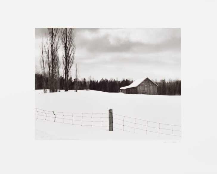 A rudimentary wire fence crosses the foreground of this image, attached to a short wooden post at bottom center. A wood structure stands at right center, its roof white with snow. At left center, four or five tall, thin, leafless trees stand.