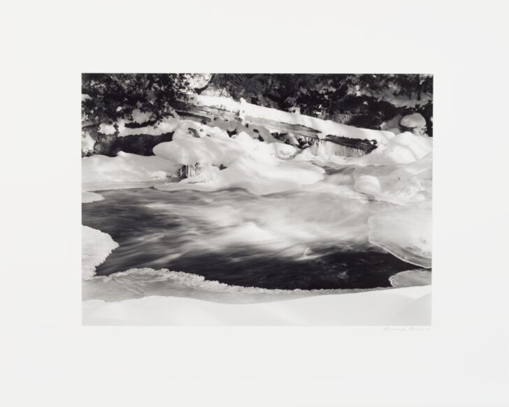 A blurred stream flows past an ice and snow covered bank. A fallen tree trunk touching the frozen part of the stream has small icicles growing along it's underside.