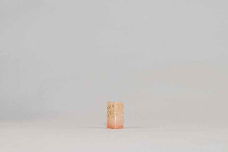 Rectangular light yellow seal with black writing on one side and red dried pigment on the bottom.