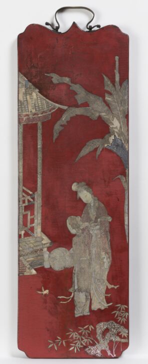 Red lacquered panel with a mother-of-pearl inlay creating the image of a tree, two women and the exterior corner of a structure. There is a metal hinge on the top.