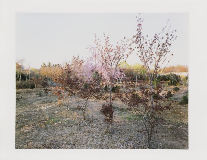 Image of two rows of young trees. The tress in the front row have red leaves and the trees in the back have pink blossoms.