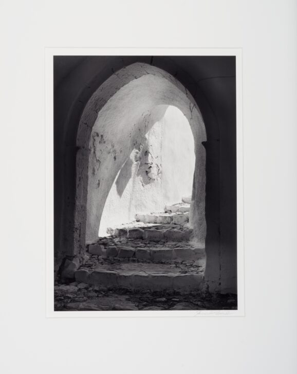 An arched stairway with rough walls is lit by a light source from above. Boulders covered in a thin layer of stucco compose wide, shallow steps.