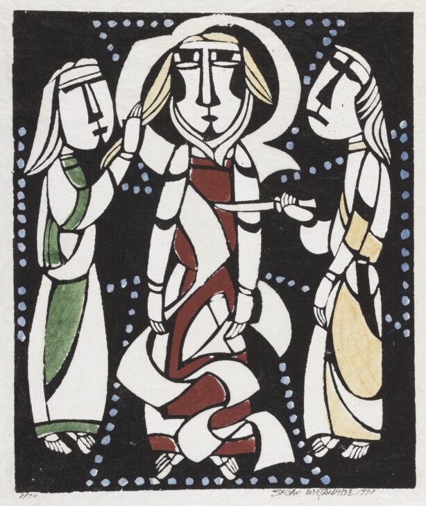 Trio of standing figures with a Christ-like figure in the center, composed of blocks of color in the manner of a stained glass window.