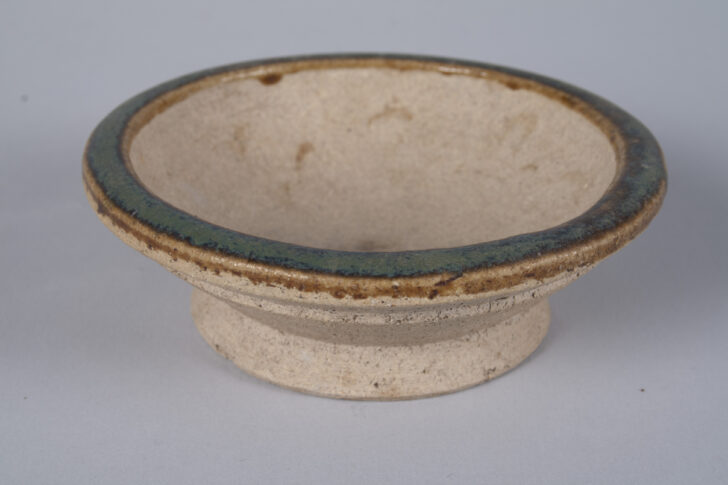 A bowl with light brown and green color around the rim. It is on a tall and thick footing.