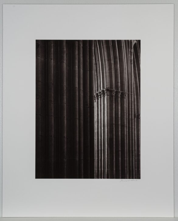 Long, rounded ridges made of smooth stone block form pillars that fill with light and shadow.