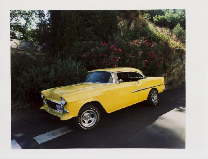 Image of a yellow car parked on the street in front of a bush with pink flowers and a house in the background on the left.