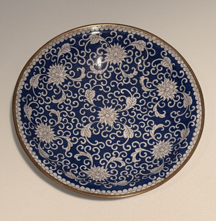 A cloisonné plate with blue background, white flowers, and scrolling design.