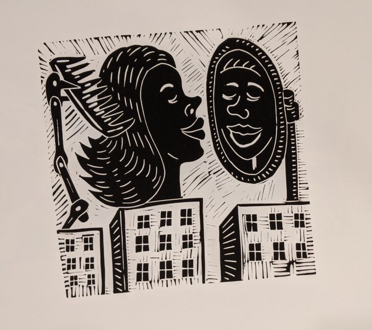 A print in black. Above three multi-storied buildings, the head of a smiling figure with shoulder-length hair is visible in profile, looking into a mirror. An arm composed of mechanical parts and a wrench-like end holds a comb to the figure's hair.