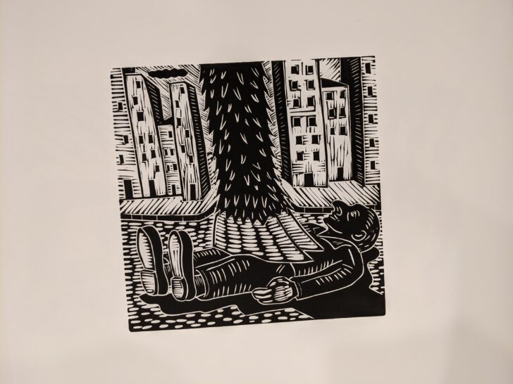 Printed in black, a large, hairy leg and hoofed foot on top of a figure lying supine in a street, a dark shadow underneath. In the background is a cityscape.